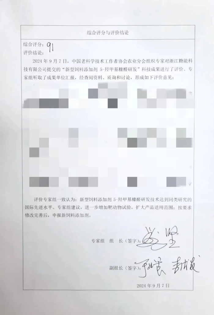 در 7 سپتامبر 2024، دستاوردهای علمی و فناوری "تحقیق و توسعه 5-هیدروکسی متیل فورفورال، یک افزودنی جدید خوراک" ارائه شده توسط شرکت فناوری انرژی قند ژجیانگ، ارزیابی کارشناسی سازماندهی شده توسط شعبه کشاورزی انجمن چین را تصویب کرد. از دانشمندان و تکنسین های ارشد.
